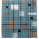 A midcentury modern abstract pattern with black lines and colourful square and rectangle shapes in blue and brown.