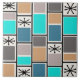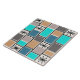 A mid century modern abstract art pattern with rectangles and sputnik starbursts in multiple colours of turquoise, gold, beige / tan, and teal blue.