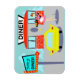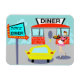 Serve up something special with this 1950's Diner Flexi Magnet. The cartoon drawing design features a red brick building with blue windows, grey double doors, and a white sign that says, "Diner" perched on the roof. In the parking lot, a second sign is on a pole. The sign has a turquoise background and a flashing red arrow pointing the way to, "Don's Diner." The sign has done its job because there is a bright yellow car with fins parked next to it. Even though we can't see them, the passengers of the car must be smacking their lips. A cute, young carhop is rollerskating her way to the car. Her brunette hair is in a bouncy ponytail. She is wearing a short, pink uniform with black trim and a white apron. Balanced on one hand, the carhop is carrying a black tray holding a giant hamburger and a refreshing, old-fashioned, glass bottle of soda. The background behind the diner is teal with light blue clouds and the silhouettes of cedar trees.