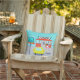 Serve up something special with this 1950's Diner Outdoor Pillow. The cartoon drawing design features a red brick building with blue windows, grey double doors, and a white sign that says, "Diner" perched on the roof. In the parking lot, a second sign is on a pole. The sign has a turquoise background and a flashing red arrow pointing the way to, "Don's Diner." The sign has done its job because there is a bright yellow car with fins parked next to it. Even though we can't see them, the passengers of the car must be smacking their lips. A cute, young carhop is roller skating her way to the car. Her brunette hair is in a bouncy ponytail. She is wearing a short, pink uniform with black trim and a white apron. Balanced on one hand, the carhop is carrying a black tray holding a giant hamburger and a refreshing, old-fashioned, glass bottle of soda. The background behind the diner is teal with light blue clouds and the silhouettes of cedar trees. The opposite side of the pillow features a fun, red brick pattern.