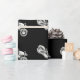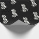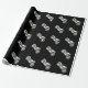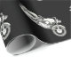 A black and white motorcycle repeated over and over on black wrapping paper.