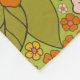 This blanket has a retro floral pattern in green, orange, and pink inspired by designs from the 1960s and 1970s.
