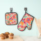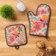 Bring a burst of 1960s–1970s joy into your kitchen with this vibrant retro flower power oven mitt and pot holder set. It features bold, oversized blooms in warm oranges, sunny yellows, punchy pinks, and cool teal accents—an irresistible mix of colour and pattern that instantly brightens any cooking space. The black trim and hanging loops give the set a crisp, modern finish while keeping the focus on that groovy floral artwork. This set is perfect for anyone who loves mid‑century style, cheerful colour palettes, or nostalgic décor with a playful twist. It makes a fun gift for home cooks, bakers, vintage‑aesthetic fans, or anyone who wants their kitchen tools to feel as joyful as the meals they create. Whether you’re outfitting your own kitchen with retro charm or gifting a little flower‑power happiness to someone else, this set brings warmth, personality, and a whole lot of groovy vibes.