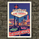 • This vintage travel poster captures the vibrant energy of the Las Vegas Strip during the 1960s. The classic design is a simulated painting on a canvas, perfect for adding a touch of nostalgic charm to any space.
