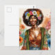 This postcard features a vibrant watercolor painting of an African American woman with an afro hairstyle adorned with colorful flowers. She is wearing a floral top, an olive green cardigan, and denim pants, accessorized with hoop earrings and a belt.