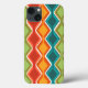 This phone case has a 1970s retro design of connected diamonds in reds, oranges, blues, and greens.