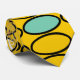 This tie has a 1970s design of ovals in red, orange, brown, white, and blue on a field of gold.