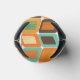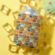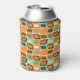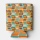 This can cooler has a mid-century modern design of rounded rectangles leaning to the side with leaning rectangles inside made from lines all in 1970s colours.