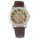 This men's watch has a mid-century modern design of rounded rectangles leaning to the side with leaning rectangles inside made from lines all in 1970s colours.
