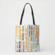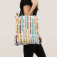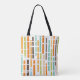 This tote bag has a mid-century modern design of vertical lines in 1970s orange, brown, green, and blue on a field of white with horizontal white lines crossing them.