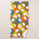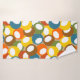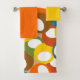 This towel set has a yellow washcloth, an orange hand towel, and a bath towel with a mid-century modern design of circles in blue, green, brown, sienna, yellow, and orange with white ovals inside.