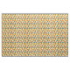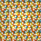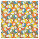 This fabric has mid-century modern design of circles in blue, green, brown, sienna, yellow, and orange with white ovals inside.
