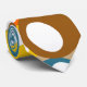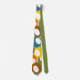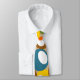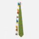 This necktie has mid-century modern design of circles in blue, green, brown, sienna, yellow, and orange with white ovals inside.