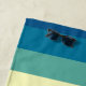 This beach towel has a 1970s design of concentric squares in retro shades of blue, white, and orange.