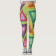 These leggings have a 1970s design on concentric triangles in shades of teal, orange, yellow, purple, and pink on a field of green.