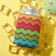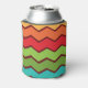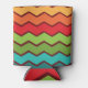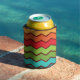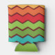 This can cooler has a 1970s design of zigzag lines in yellow, orange, red, green, and blue on a field of brown.