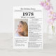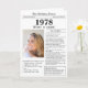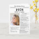 Say happy birthday to someone born in 1978 with this unique Newspaper style birthday card, including a photo of the recipient and a collection of fun facts and world news from the year of their birth. Get creative and create a personalised keepsake. Designed to resemble a vintage newspaper in classic black and white style. A cute and fun way to celebrate the 1970s!