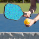 Stand out on the court with this funky 80s Memphis style pickleball paddle! This design features blue, pink, black, and yellow squiggles, triangles, diamonds, and circles, along with initials in pink.