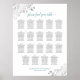 This beautiful wedding seating chart features table assignments for 190 guests, with 10 people at each table. The design is simple yet elegant with dark gray and teal or turquoise text on a white background. There are lacy silver faux foil curls and swirls in the corners and fancy script calligraphy reading "please find your table."