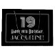 This vintage look Roaring '20s appearance inspired birthday gift bag design features a large art deco appearance inspired number "19", the message "Happy 19th Birthday,", a custom name, and a border pattern consisting of thin lines. The background is coloured black. A birthday themed gift bag like this might be used to wrap a gift or present being given to celebrate somebody’s nineteenth birthday. [~Z0000497]