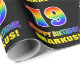This colourful, fun, and cheerful birthday-themed wrapping paper design features a large number "19" and the message "HAPPY BIRTHDAY,", both coloured with a rainbow spectrum gradient inspired pattern, along with a bold yellow customisable recipient name. The background is coloured black. Fun birthday themed wrapping paper like this could be used to wrap a gift or present being given to somebody who is celebrating their 19th birthday. [~Z0000475]