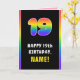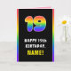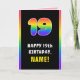 This upbeat and vibrant birthday greeting card design features a big number “19“ having a multicolor rainbow spectrum inspired gradient pattern, along with the message “HAPPY 19th BIRTHDAY,”, and a personalised recipient name. The inside has a customisable birthday greeting message, or could perhaps be cleared and left blank if a message is to be written by hand instead. A joyful, editable birthday greeting card like this might be used to celebrate somebody’s nineteenth birthday. [~Z0000636]