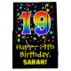 This vibrant, fun, and exciting birthday themed gift bag design features a large number "19" with a rainbow spectrum gradient style pattern, along with the message "Happy 19th Birthday,", and an editable recipient name. It also has a background pattern featuring star shapes of various sizes and colours. A birthday themed giftbag like this might be a fun way to wrap a gift or present being given to celebrate somebody’s 19th birthday. [~Z0000510]