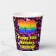 This happy and fun birthday themed paper cup design features a large number “19” with a rainbow spectrum gradient inspired pattern, along with the message “Happy 19th Birthday,”, and a custom name. The background features a pattern of red, pink, and purple heart shapes of various sizes. Loving, upbeat paper cups like this might be fun to have at a birthday party/celebration being held to honour somebody’s nineteenth birthday. [~Z0000548]