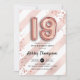 19th birthday party invitation. Elegant design in faux glitter rose gold with stripes. Invite card with rose gold number 19 balloons, script font with confetti. Blush coral pink, white. Perfect for a stylish nineteenth bday celebration. Message me if you need custom age.