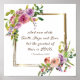 Inspirational quote scripture Christian wedding poster depicts elegant floral watercolor arrangements including peach, pink and purple roses and greenery on a gold frame. It features Bible Verse 1 Corinthians 13:13, "And now abide Faith, Hope and Love, but the greatest of these is LOVE."