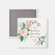 Inspirational scripture magnet depicts an elegant oil painted floral design with white and pink roses and greenery on an oil textured background. It features Bible Verse 1 Corinthians 13:7-8, "Love… hopes all things, endures all things, Love never fails."