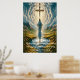 A serene and mystical landscape. At the centre, a figure with long flowing hair stands with their back to the viewer, facing a massive wooden cross that rises majestically from the ground. The cross is adorned with chains, and its top emanates a radiant light. Surrounding the cross is a mesmerising cloud formation that spirals upwards, illuminated by the same radiant light. Below the cross, ripples in a calm body of water mirror the clouds and the figure. The landscape is flanked by rugged mountains on either side, and the entire scene is bathed in a soft, ethereal light, creating a sense of tranquillity and reverence.