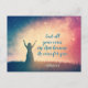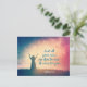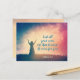 Beautiful inspirational quote scripture custom postcard depicts a women in a field with her hands lifted to the Lord. It features Bible Verse 1 Peter 5:7, Cast all your cares on him because he cares for you.~