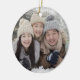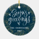 This festive double-sided ornament features a full photo and fun lettering. The front features a full family photo. On the back, white lettering reads "Season's Greetings" with your name and holiday year below. The typography design is framed by a gold wreath against a navy blue background.