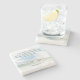 Inspirational scripture stone coaster depicts a pastel watercolor design with a small village of houses, mountains and a beautiful blue sky. It features Bible Verse 1 Thessalonians 1:4, "Dear brothers and sisters, you are dearly loved by God and we know that he has chosen you to be his very own." *
