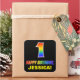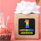 This cheerful, fun, and colourful birthday sticker design features a large number "1" and the message "HAPPY BIRTHDAY,", both coloured with a rainbow spectrum gradient inspired pattern, along with a bold yellow personalised name. The background is coloured black. Fun stickers like this could be used when wrapping a birthday present or gift being given to somebody who is celebrating their 1st birthday, or might be given out to the guests at a birthday party or celebration. [~Z0000480]
