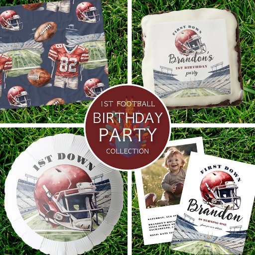 Celebrate your little one's 1st birthday with our adorable Down Football design! Perfect for a fun sports-themed party, featuring a cute watercolor illustration of a red football helmet on a green field. Your kids will love it! Get this unique party design from our Zazzle store today. Perfect for a one year old birthday celebration!