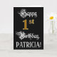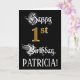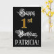 The front of this elegant and luxurious birthday-themed greeting card design features the message “Happy 1st Birthday,”, and a personalised recipient name. Part of the message is in a fancy script-style text, the large number “1st” has a faux/imitation gold-inspired look pattern, and the background is coloured black. The inside has a customisable birthday greeting message, or could perhaps be cleared and left blank if a message is to be written by hand instead. A formal, personalised birthday greeting card like this might be a respectable way to send some birthday wishes to somebody who is celebrating their first birthday. [~Z0000559]