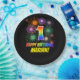 This cheerful, colourful, and fun birthday-themed paper plate design features a large number "1" and the message "HAPPY BIRTHDAY,", both coloured with a rainbow spectrum gradient inspired pattern, along with a bold yellow custom name. It also features a exciting and vibrant bursting celebratory fireworks inspired pattern. It has a black coloured background. Fun, personalised paper plates like this might be used at a birthday party being held to celebrate somebody’s 1st birthday. [~Z0000489]