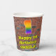This vibrant and fun urban graffiti and street art themed birthday paper cup design features a large number “1” with a colourful rainbow spectrum gradient inspired pattern, along with the message “Happy 1st Birthday,”, and a personalised name. The background has a brick wall pattern. Colourful, vibrant paper cups like this might be fun to use at a birthday party/celebration being held to honour somebody’s 1st birthday. [~Z0000543]