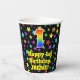 This cheerful and joyful birthday paper cup design features a large number “1” with a rainbow spectrum gradient inspired pattern, along with the message “Happy 1st Birthday,”, and a customisable name. The background features a multicolored pattern featuring many star shapes with different colours and sizes. Vibrant, colourful paper cups like this might be fun to use at a birthday celebration being held to honour somebody’s first birthday. [~Z0000540]