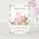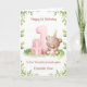 This watercolour 1st birthday card is suitable for a granddaughter or daughter. The design includes a greenery border, a birthday number 1 in pink, and a teddy bear with birthday balloon, gifts and party hat. Child's name is included on the front of the card.