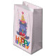 A cute baby hippo wearing a birthday hat with a big 1 on it sits in front of her birthday cake. Adorable 1st birthday gift bag for your little one's gifts.