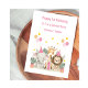 This 1st birthday card is suitable for twin daughters, granddaughters or friends. The design includes an infant elephant, giraffe and lion, birthday balloons, gifts and hats.