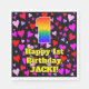 This colourful and joyful birthday paper napkin design features a large number “1” having a rainbow spectrum gradient inspired pattern. It also features the message “Happy 1st Birthday,”, and a personalised name. The background features a pattern of red, pink, and purple heart shapes of various sizes. Loving, friendly paper napkins like this might be fun to have at a birthday celebration being held in celebration of somebody’s first birthday. [~Z0000550]