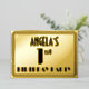 The front of this stylish and 1920s-1930s era style inspired first birthday party/celebration foil invitation card design features a custom name, an art deco look inspired number “1st”, the message “BIRTHDAY PARTY”, and a border pattern consisting of lines. The back features personalised details about the event, such as the date, time, location, and any other important information. Elegant, luxurious, customisable invitations like these might be used to invite attendees/guests to a birthday gathering/party being held to celebrate somebody’s 1st birthday. [~Z0000606]