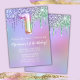 1st birthday party Invitation purple pink glitter drips 1st birthday party invitation for a 1 year old girl with modern script writing and fun foil balloons.