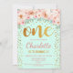 Elegant design in faux glitter gold and mint green with greenery and floral accent. Invite card with glitter "One" in script font with confetti. Blush coral pink, white and teal. Perfect for a stylish 1st bday celebration.