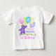 A cute little purple teddy bear princess skipping among pretty pink and yellow flowers with 5 pastel balloons announcing her 1st birthday party on t shirt. This delightful bear has a yellow jewelled crown. She is dressed up in delicate flower accessories. Personalise with your little princess’s name. Original design by Anura Design Studio.