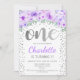 1st Birthday Party - White Silver Purple Invitation